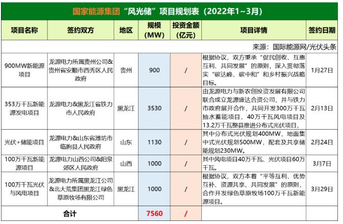 截至2022年3月31日,國(guó)家能源集團(tuán)共簽約(規(guī)劃)5個(gè)風(fēng)光儲(chǔ)項(xiàng)目,明確項(xiàng)目規(guī)模共計(jì)7.56GW。