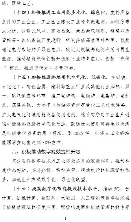加快推進(jìn)終端用能電氣化、低碳化。在鋼鐵、石化化工、有色金屬、建材等重點(diǎn)行業(yè)及其他行業(yè)加熱、烘干、蒸汽供應(yīng)等環(huán)節(jié),推廣電爐鋼、電鍋爐、電窯爐、電加熱、高溫?zé)岜?、大功率電熱?chǔ)能鍋爐等替代工藝技術(shù)裝備,擴(kuò)大電氣化終端用能設(shè)備使用比例。穩(wěn)妥有序?qū)I(yè)生產(chǎn)過(guò)程中低溫?zé)嵩催M(jìn)行電氣化改造。鼓勵(lì)優(yōu)先使用可再生能源滿足電能替代項(xiàng)目的用電需求。到2025年,電能占工業(yè)終端能源消費(fèi)比重達(dá)到30%左右。