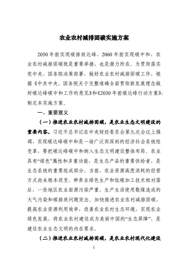 為貫徹落實(shí)碳達(dá)峰碳中和重大決策部署,推進(jìn)農(nóng)業(yè)農(nóng)村綠色低碳發(fā)展,我們制定了《農(nóng)業(yè)農(nóng)村減排固碳實(shí)施方案》,現(xiàn)印發(fā)你們,請結(jié)合實(shí)際貫徹落實(shí)。