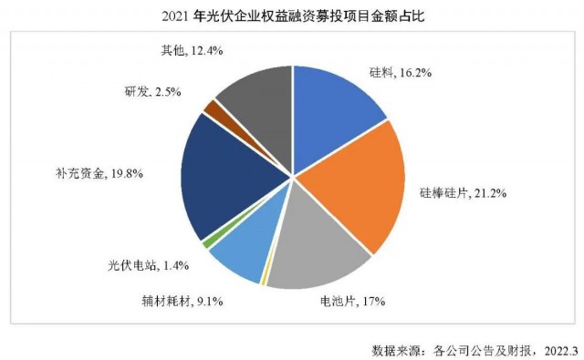 2021年我國光伏行業(yè)融資環(huán)境持續(xù)改善,共27家光伏企業(yè)在A股及港股資本市場使用權(quán)益融資方式募資,涉及權(quán)益融資項目28個,募資總額1058.33億元,同比增長48.2%。其中,再融資項目21個,募集資金758億元,同比增長30%;IPO上市融資項目7個,募集資金301億元,同比增長129.2%。截至2022年3月,2021年權(quán)益融資項目中,已完成融資合計700.77億元,同比增長16.3%。