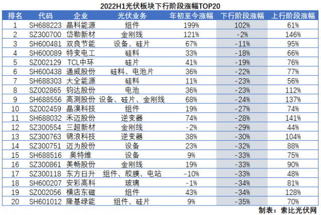 2022年上半年,光伏板塊在宏觀環(huán)境和行業(yè)基本面的共同作用下,經(jīng)歷了一輪大悲大喜的極端行情,在一度暴跌39%的情況下,4月27日A股市場企穩(wěn)后又暴漲60%。在這輪急漲急跌的行情中,既體現(xiàn)了光伏板塊的成長屬性,又彰顯了行業(yè)基本面的高景氣——畢竟在美聯(lián)儲加息周期內(nèi),成長性板塊的表現(xiàn)相對不佳,但光伏板塊在上行行情中卻有眾多個(gè)股再創(chuàng)歷史新高。