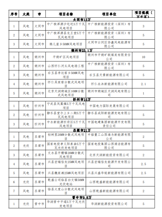 為推動(dòng)全省新能源項(xiàng)目健康可持續(xù)發(fā)展,省能源局組織各市對(duì)2020年及之前長期占用資源、遲遲未能建成的風(fēng)電光伏發(fā)電項(xiàng)目進(jìn)行了梳理。相關(guān)地市上報(bào)了本地區(qū)擬廢止項(xiàng)目清單,經(jīng)我局匯總,擬將云崗區(qū)協(xié)鑫雅兒崖鄉(xiāng)等54個(gè),總計(jì)規(guī)模138.8萬千瓦風(fēng)電光伏發(fā)電項(xiàng)目予以廢止,現(xiàn)予公示。相關(guān)企業(yè)如有異議,請(qǐng)向市能源局提出書面意見,并在公示期(5個(gè)工作日)內(nèi),由市能源局上報(bào)省能源局。