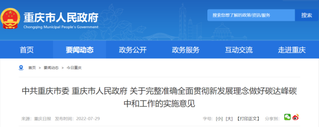 7月29日,中共重慶市委、重慶市人民政府出臺關(guān)于完整準(zhǔn)確全面貫徹新發(fā)展理念做好碳達峰碳中和工作的實施意見(以下簡稱“意見”)。