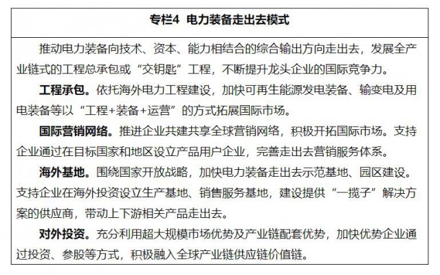13.強化推廣應(yīng)用政策引導(dǎo)。支持將符合條件的電力裝備納入國家、地方相關(guān)重大技術(shù)裝備指導(dǎo)目錄,研究發(fā)布重大技術(shù)裝備推廣應(yīng)用導(dǎo)向目錄。利用首臺(套)重大技術(shù)裝備保險補償機制試點、能源領(lǐng)域首臺(套)評定和評價、綠色采購等政策。引導(dǎo)行業(yè)組織、研究機構(gòu)等搭建供需對接平臺,加快電力裝備推廣應(yīng)用。培育打造具有國際競爭力的“中國重裝”品牌。