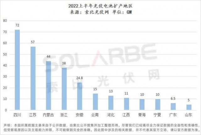據(jù)索比光伏網(wǎng)統(tǒng)計(jì),上半年電池組件擴(kuò)產(chǎn)合計(jì)超650GW,其中電池?cái)U(kuò)產(chǎn)規(guī)模292.5GW,組件擴(kuò)產(chǎn)規(guī)模360.5GW,均大幅超出終端市場(chǎng)需求。隆基(66GW)、晶科(52GW)、晶澳(36GW)、東方希望(35GW)、東方日升(30GW)等企業(yè)領(lǐng)銜擴(kuò)產(chǎn)。從擴(kuò)產(chǎn)地區(qū)來看,電池?cái)U(kuò)產(chǎn)主要集中在四川、江蘇、內(nèi)蒙古、浙江、安徽等地,而組件擴(kuò)產(chǎn)主要集中在安徽、浙江、甘肅、內(nèi)蒙古、江西等地。