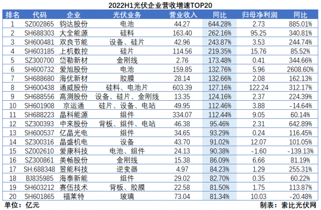 營收增速方面,除了硅料企業(yè)以外,諸多“跨界者”受益于新增產能的釋放以及較低的營收基數紛紛迎來暴發(fā)式增長。例如,從汽車零部件行業(yè)跨界光伏的鈞達股份營收增速高達644%,由光伏設備領域進入硅片環(huán)節(jié)的雙良節(jié)能、上機數控、高測股份和京運通營收增速分別達到244%、219%、124%和112%。