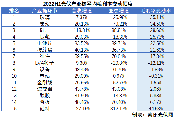 結合產業(yè)鏈來看,玻璃環(huán)節(jié)隨著去年一季度末新增產能的投產,產品價格相較于去年同期大幅下滑,導致毛利率平均降幅高達35.11%。PV Infolink數據顯示,2022年上半年光伏玻璃3.2mm鍍膜和2.0mm鍍膜平均價格較去年同期分別下滑18%和23%。