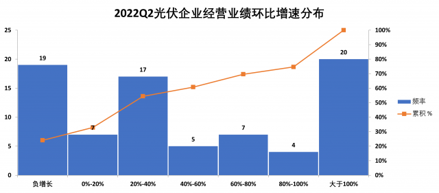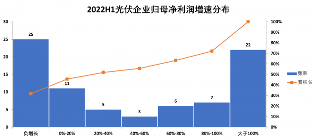 相比于營收的普漲態(tài)勢,光伏企業(yè)的經營業(yè)績卻出現顯著分化。2022年上半年,79家光伏企業(yè)的歸母凈利潤總額達到650億元,平均增速為32%。其中,利潤負增長的企業(yè)占比高達32%,而業(yè)績翻倍增長的企業(yè)占比亦達到28%,呈現顯著的“兩極分化”態(tài)勢。不過,與2021年不同的是,產業(yè)鏈中游的諸多專業(yè)化廠商紛紛迎來“困境反轉”,而業(yè)績出現下滑的企業(yè)多為競爭力一般的中小市值企業(yè)。