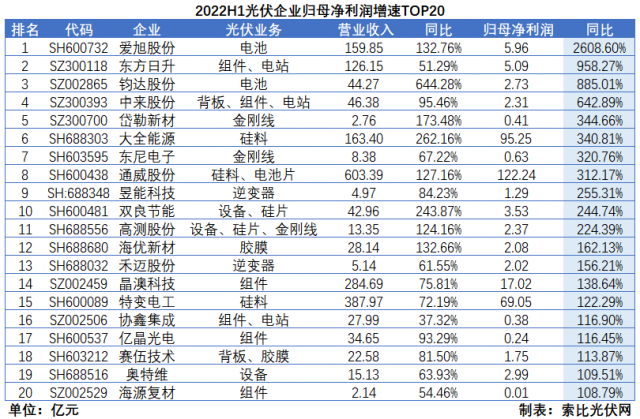 利潤增速方面,除了硅料企業(yè)延續(xù)高增長以外,去年因硅料價格暴漲而出現虧損的產業(yè)鏈中游專業(yè)化廠商,2022年上半年受益于供應鏈管理能力的提升以及產品結構的優(yōu)化,紛紛迎來困境翻轉,其中愛旭股份、東方日升、中來股份的利潤增速分別達到2609%、958%和643%。此外,岱勒新材、東尼電子兩大金剛線廠商受益于硅片環(huán)節(jié)的擴產以及細線化發(fā)展趨勢,疊加自身的產能擴張和成本下降,利潤增速均超300%。