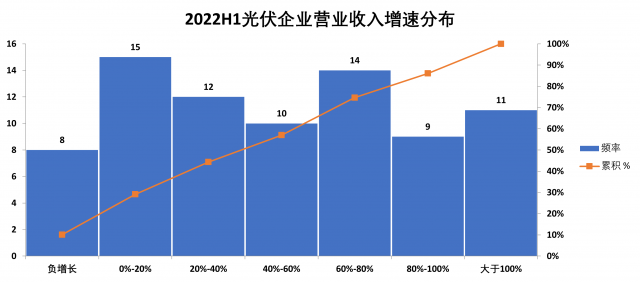 2022年上半年,79家光伏企業(yè)合計創(chuàng)收5571億元,平均增速(“平均”指“中位數”,下同)達到48%。令人欣喜的是,營收負增長的企業(yè)占比僅為10%,而營收增速超過40%的企業(yè)占比則高達71%。其中,除了硅料企業(yè)繼續(xù)保持高速增長以外,眾多“跨界者”也乘著光伏行業(yè)的“東風”,迎來暴發(fā)式增長。