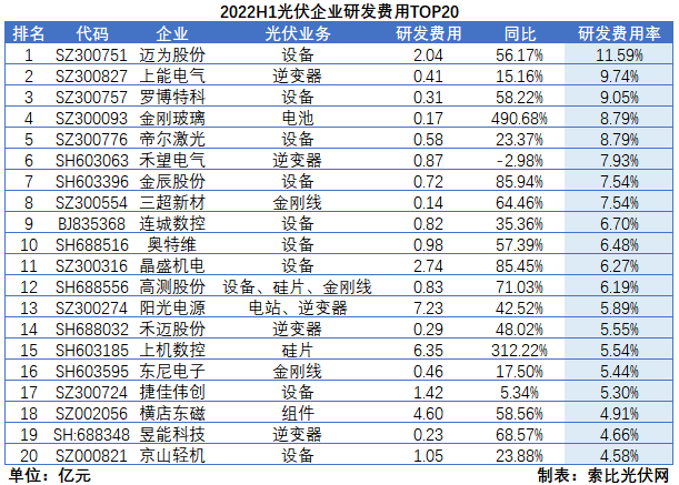 當然,N型電池技術之所以能夠不斷取得突破性進展,離不開生產設備的持續(xù)升級與迭代。在研發(fā)費用率排名中,前20位中有10家是設備廠商,其中HJT設備龍頭邁為股份的研發(fā)費用率更是高達11.59%。在近期的中報業(yè)績交流會中,邁為股份表示預計今年下半年HJT組件成本能夠與PERC組件持平,至2023年HJT電池片成本優(yōu)勢將會逐步顯現。