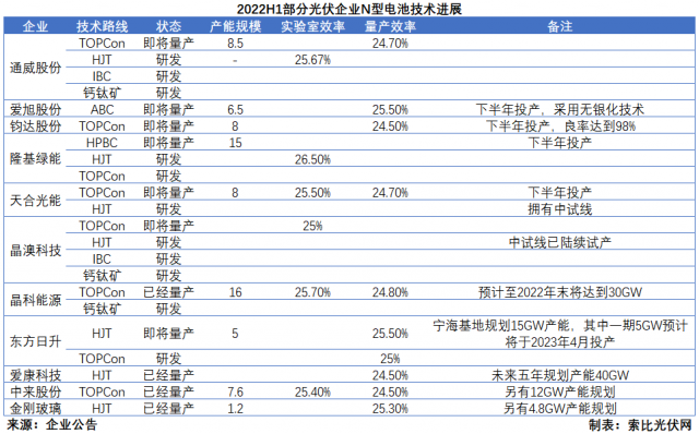 除了盈利能力以及經營業(yè)績顯著改善以外,電池片環(huán)節(jié)的N型電池技術變革也成為了時下業(yè)界以及資本市場關注的焦點。2022年上半年,TOPCon、HJT乃至鈣鈦礦等電池片概念成為A股市場炒作的熱點,期間更是誕生了寶馨科技、京山輕機、金剛玻璃等一眾“妖股”。而在中報中,各大龍頭企業(yè)也重點披露了N型電池技術的進展情況。