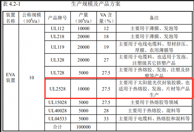據(jù)悉,該項目共生產(chǎn) 9 個牌號的 EVA 產(chǎn)品,其中牌號UL2528產(chǎn)品可用于生產(chǎn)光伏料,產(chǎn)能為1萬噸/年,其VA含量為27.5%。