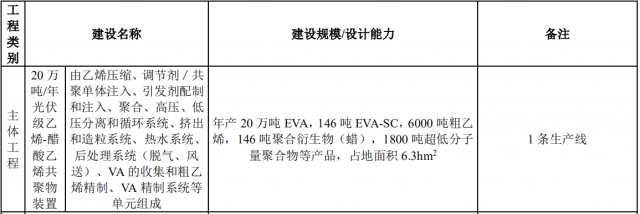 另外,根據(jù)環(huán)評報告書,虹景公司同期擬建項目包括 50 萬噸/年 EVA 項目(一階段)以及高端共聚新材料項目(一階段),計劃建成時間分別為 2025 年 3 月和 2024 年 10 月。50 萬噸/年 EVA 項目(一階段)主要建設(shè) 20 萬 t/a 光伏級乙烯-醋酸乙烯共聚物裝置(Ⅱ)以及 20 萬 t/a光伏級乙烯-醋酸乙烯共聚物裝置(Ⅲ),高端共聚新材料項目(一階段)主要建設(shè) 1 套 10 萬 t/a 碳五分離裝置、1 套 10 萬 t/a 碳九分離裝置及現(xiàn)場機柜室、10/0.4kV 變配電室 SS304、冷凍站、污染雨水池等配套工程。