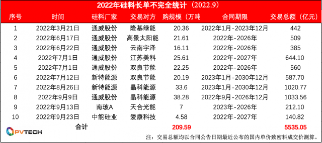 2022年以來硅料長單不完全統(tǒng)計,PV Tech