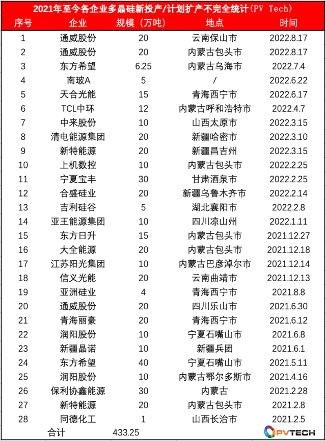 2021年至今各企業(yè)多晶硅新投產(chǎn)/計劃擴(kuò)產(chǎn)不完全匯總(PV Tech)