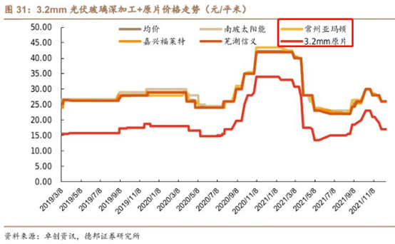 以3.2mm光伏玻璃為例。過去幾年,剔除異常波動年份,加工后的光伏玻璃價格基本在25元/平米左右,原片價格約為15元/平米。價差10元/平米。