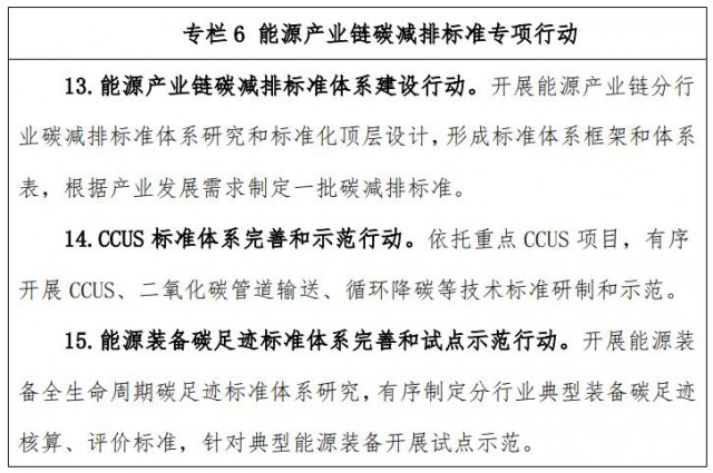 圍繞能源領域二氧化碳捕集利用與封存(CCUS)有關技術研發(fā)和項目建設需求,加快推進相關標準管理體系和標準體系完善,推進二氧化碳捕集、輸送、封存監(jiān)測、泄漏預警、驅(qū)油等關鍵環(huán)節(jié)標準制修訂。