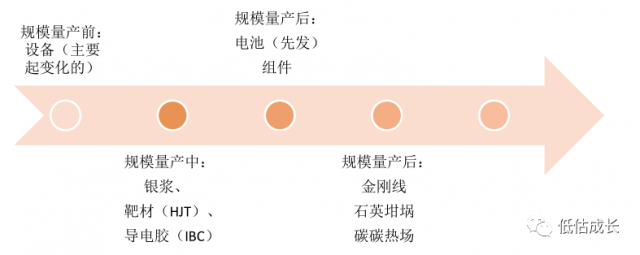 投資維度1:短期看業(yè)績釋放順序,設(shè)備>新輔材>電池組件>老輔材。
