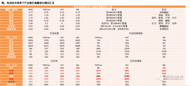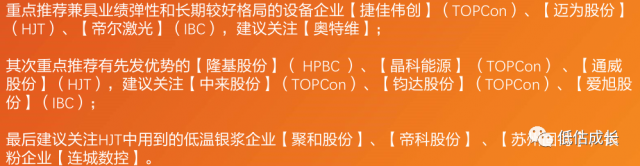 核心結(jié)論為:短期TOPCon與P型IBC具有優(yōu)勢,中期TOPCon、HJT、IBC或?qū)⒐泊妫L期預(yù)計將往TBC&HBC轉(zhuǎn)型;新技術(shù)變化下,較看好設(shè)備、電池組件、銀漿&銀粉。