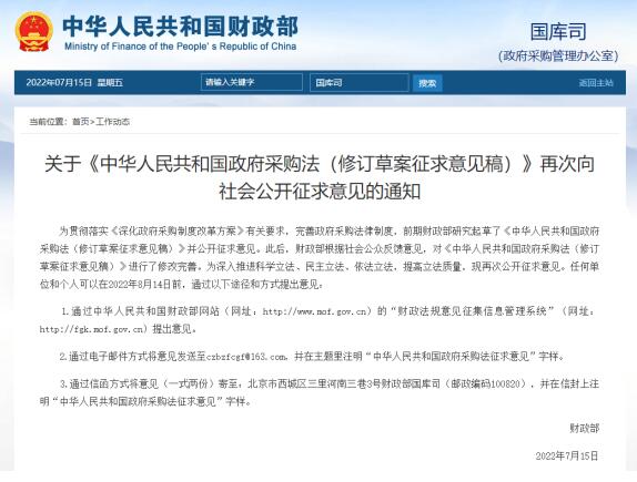 ?圖:財政部國庫司發(fā)布關(guān)于《中華人民共和國政府采購法(修訂草案征求意見稿)》