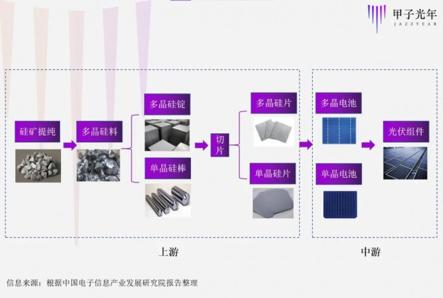 一個晶硅光伏組件的誕生,要經(jīng)歷硅料、硅片、電池片以及組件封裝四步:先將硅礦提純?yōu)槎嗑Ч枇?,再進行鑄錠或拉晶,切片,產(chǎn)生多晶/單晶硅片,然后結(jié)合磷、硼等輔材,改變硅片的物理結(jié)構(gòu),使之可以發(fā)電,形成電池片,最后將電池片串聯(lián),添加玻璃、蓋板進行封裝,即最終的組件產(chǎn)品。