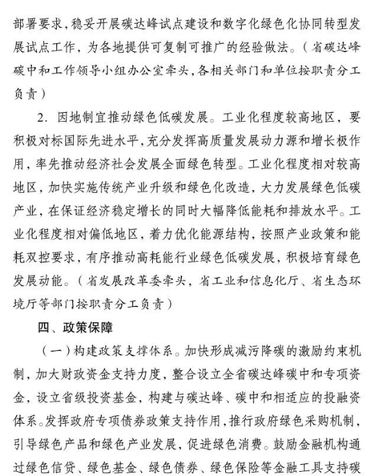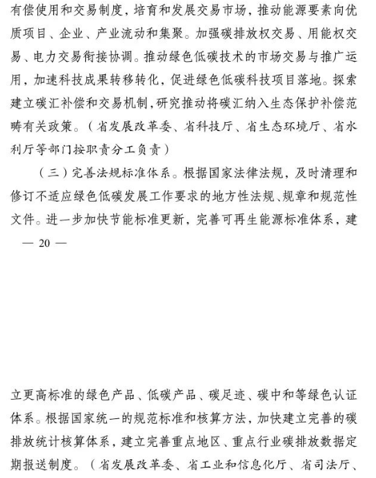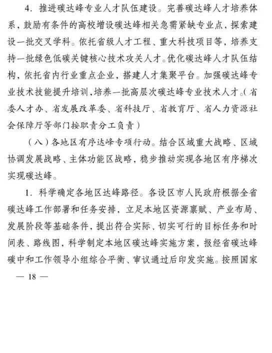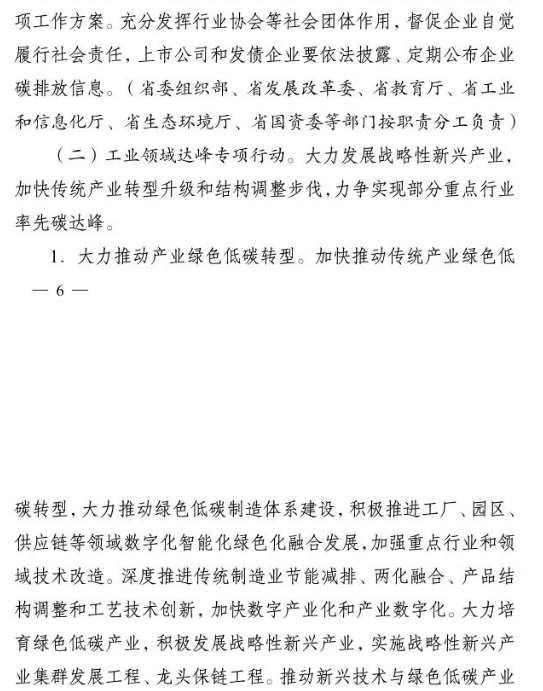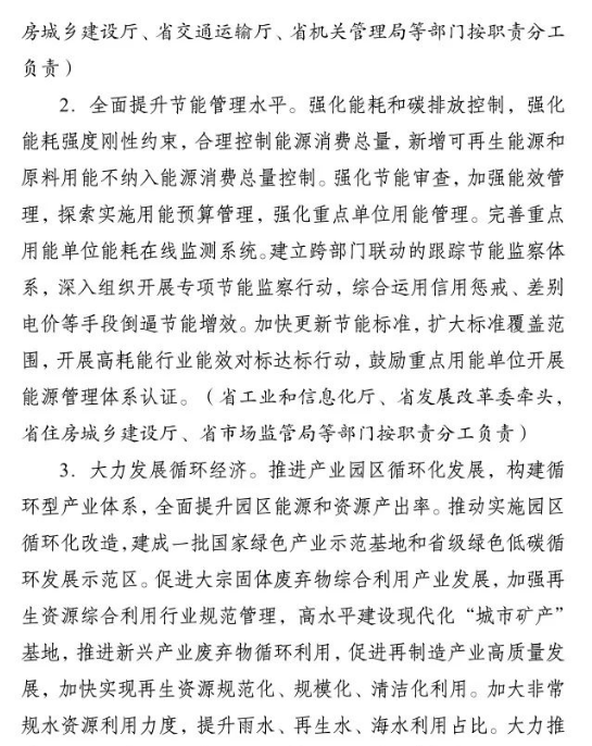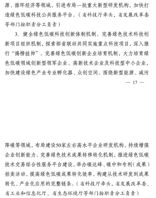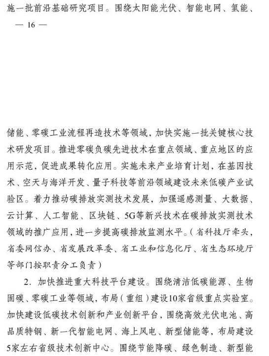 加快推進重大科技平臺建設。圍繞清潔低碳能源、生物固碳、零碳工業(yè)等領域,布局(重組)建設10家省級重點實驗室。加快建設低碳技術創(chuàng)新和產(chǎn)業(yè)創(chuàng)新平臺,圍繞高效光伏電池、高品質(zhì)特鋼、新一代智能電網(wǎng)、海上風電、新型儲能等,布局建設5家左右省級技術創(chuàng)新中心。圍繞節(jié)能降碳、綠色制造、新型能源、循環(huán)經(jīng)濟等領域,引進布局一批重大新型研發(fā)機構,加快打造綠色低碳科技公共服務平臺。