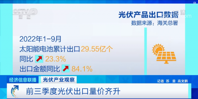 光伏產(chǎn)品的出口表現(xiàn)也超出預(yù)期,海關(guān)數(shù)據(jù)顯示,今年前9個月,太陽能電池累計出口29.55億個,同比增長23.3%,出口金額同比增加84.1%,實現(xiàn)量價齊升。