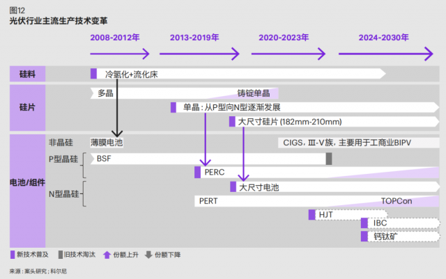 其一,單瓦組件成本長(zhǎng)期將逐步下降,主要得益于技術(shù)演進(jìn)帶來(lái)的轉(zhuǎn)換效率提升。電池組件主流技術(shù)正在快速演進(jìn)迭 代( 如 圖 12),已 經(jīng) 從 傳 統(tǒng) P 型 向 PERC+ 和 N 型TOPCon 及 HJT 發(fā)展,未來(lái)隨著新型技術(shù)的發(fā)展,如具備成本優(yōu)勢(shì)的鈣鈦礦在突破穩(wěn)定性瓶頸后、其疊層電池大幅提升太陽(yáng)光利用水平,將有可能進(jìn)一步大幅降低降低單位成本。同時(shí),隨規(guī)模效應(yīng)顯現(xiàn),單位產(chǎn)線(xiàn)投資成本下降以及人均產(chǎn)出率提升將進(jìn)一步拉低電池組件成本。