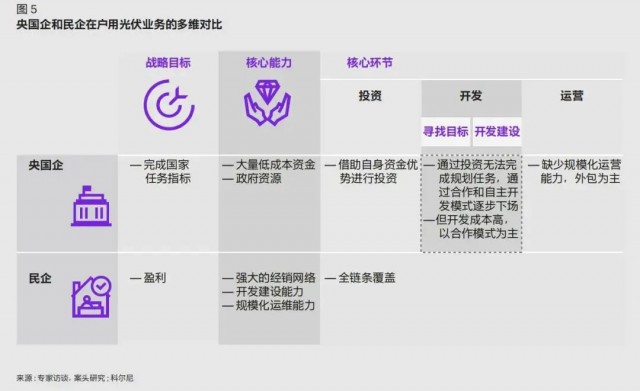 由于央國(guó)企和民營(yíng)企業(yè)對(duì)于戶(hù)用光伏的戰(zhàn)略定位、切入賽道和自身能力均不同,因此其各自具備獨(dú)特的商業(yè)模式,且在產(chǎn)業(yè)鏈上逐漸形成互補(bǔ)合作的上下游關(guān)系(如圖 5)。