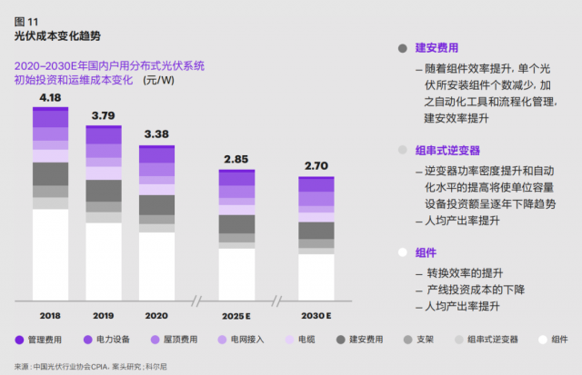 上網(wǎng)電價(jià)趨于穩(wěn)定的同時(shí),光伏投資及發(fā)電成本將進(jìn)一步下降,帶動(dòng)盈利能力提升。科爾尼預(yù)計(jì),在 2025 年國(guó)內(nèi)戶(hù)用分布式光伏系統(tǒng)初始投資和運(yùn)維成本將下降至 2.85 元/ 瓦,并 于 2030 年進(jìn)一步降至約 2.70 元 / 瓦( 如 圖11)。