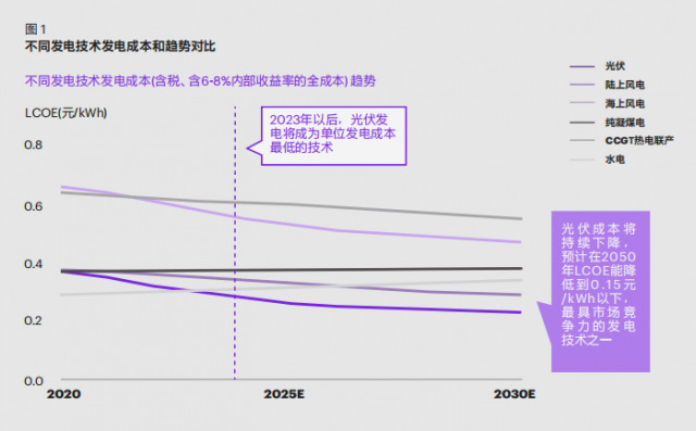 能源結(jié)構(gòu)調(diào)整無(wú)疑是能源戰(zhàn)略中最重要的一環(huán)。在眾多新能源發(fā)展路線(xiàn)中,光伏是最優(yōu)質(zhì)的選項(xiàng)之一,光伏發(fā)電技術(shù)成本優(yōu)勢(shì)突出??茽柲犷A(yù)測(cè),到 2023 年后,光伏發(fā)電的平準(zhǔn)化度電成本(LCOE)將在所有發(fā)電技術(shù)中達(dá)到最低,并預(yù)計(jì)在 2050 年進(jìn)一步下降至 0.15 元 /kWh(如圖 1)。成本優(yōu)勢(shì)下,光伏有潛力成為未來(lái)中長(zhǎng)期發(fā)展最快的細(xì)分賽道。