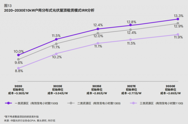 系統(tǒng)成本的大幅下降將大幅提升收益率。據(jù)科爾尼預(yù)測(cè),在未來(lái)三類(lèi)資源區(qū)的屋頂租賃模式 IRR 都將穩(wěn)步上升,并將 于 2030 年分別增至 13.3%、12.9% 和 11.9%(如圖13)。