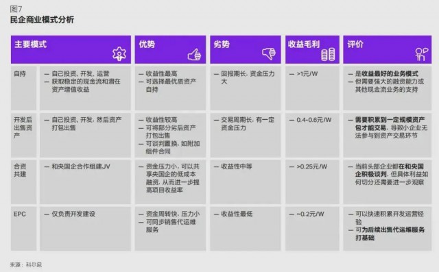 自持資產(chǎn)包是民企的主流業(yè)務(wù)模式。民企通過(guò)全程進(jìn)行投資、開(kāi)發(fā)與運(yùn)營(yíng),獲取穩(wěn)定的現(xiàn)金流和潛在資產(chǎn)增值收益,是當(dāng)前收益最好的模式,毛利可超過(guò) 1 元 /W。但由于對(duì)資金要求較高且回報(bào)周期長(zhǎng),通常需要強(qiáng)大的融資能力或其他現(xiàn)金流業(yè)務(wù)的支持。