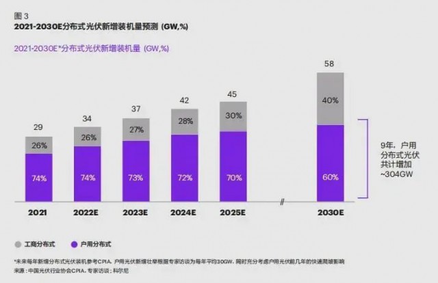 根據(jù)市場(chǎng)趨勢(shì),科爾尼認(rèn)為, 2025 年以前戶(hù)用光伏會(huì)在政策和盈利性提升驅(qū)動(dòng)下大幅提速,后期隨著整縣推進(jìn)結(jié)束,預(yù)期 2025-2030 增速會(huì)略有放緩。保守預(yù)計(jì)中國(guó)市場(chǎng)到 2030 年將累計(jì)增加戶(hù)用光伏超過(guò) 300GW,市場(chǎng)空間廣闊(如圖 3)。