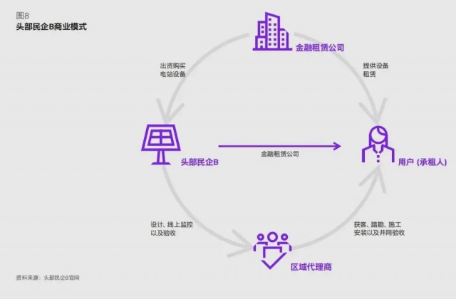 與民企 A 大量資產(chǎn)自持模式不同,民企 B 打造了一條輕資產(chǎn)模式(如圖 8):引入金融租賃公司授信托底,自己則作為開(kāi)發(fā)方賺取差價(jià),同時(shí)提供帶運(yùn)維服務(wù)以獲得持續(xù)的管理費(fèi)收入。民企B的核心優(yōu)勢(shì)在于其家電業(yè)務(wù)所積累的廣泛渠道資源,與此同時(shí),通過(guò)大幅度讓利經(jīng)銷(xiāo)商并提供更快付款節(jié)奏,公司在前期搶占了部分市場(chǎng)資源。