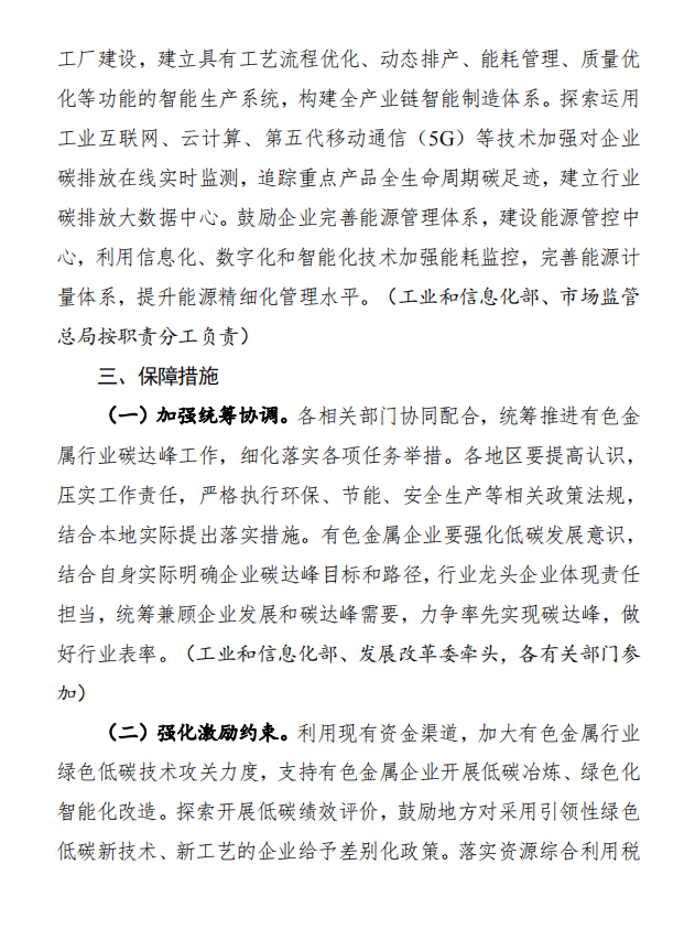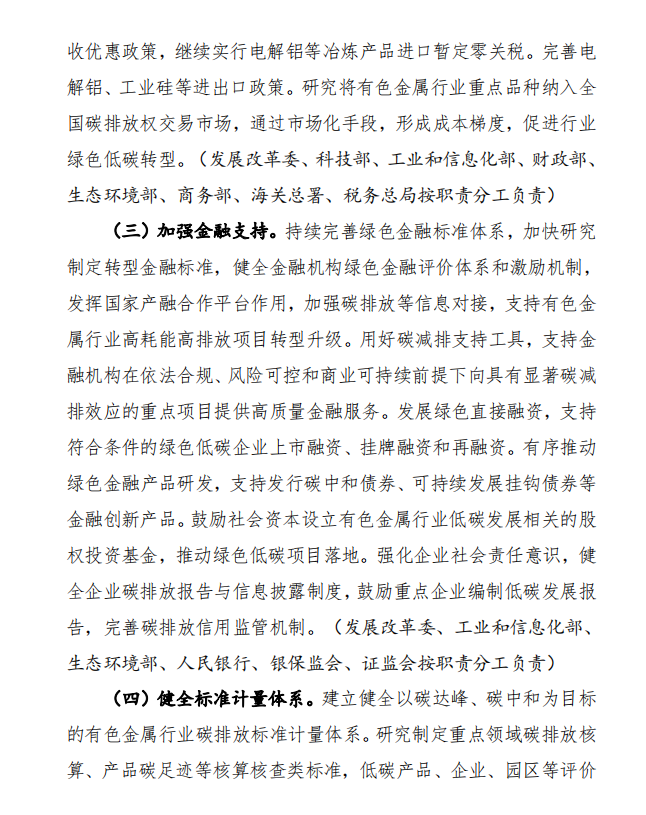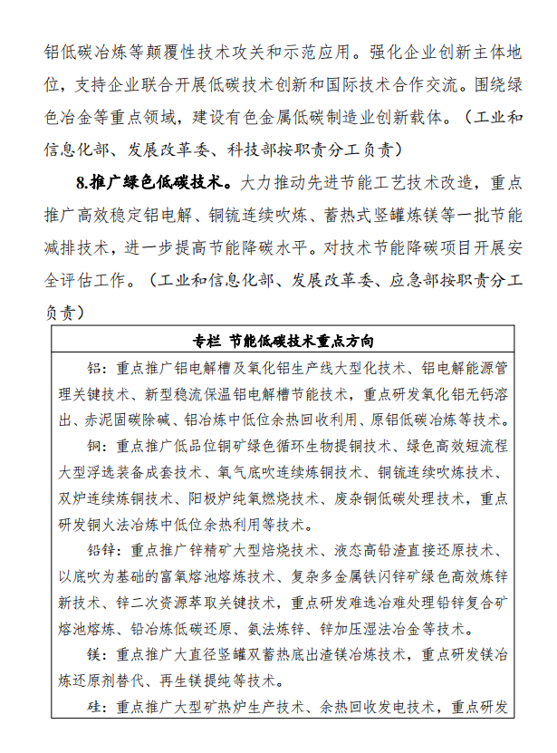 11月15日,工業(yè)和信息化部、國家發(fā)展和改革委員會和生態(tài)環(huán)境部發(fā)布《關(guān)于印發(fā)有色金屬行業(yè)碳達(dá)峰實(shí)施方案的通知》,(以下簡稱通知)通知指出,控制化石能源消費(fèi)。推進(jìn)有色金屬行業(yè)燃煤窯爐以電代煤,提升用能電氣化水平。在氣源有保障、氣價(jià)可承受的條件下有序推進(jìn)以氣代煤。推動落后自備燃煤機(jī)組淘汰關(guān)?;虿捎们鍧嵢剂咸娲?yán)禁在國家政策允許的領(lǐng)域以外新(擴(kuò))建燃煤自備電廠,推動電解鋁行業(yè)從使用自備電向網(wǎng)電轉(zhuǎn)化。支持企業(yè)參與光伏、風(fēng)電等可再生能源和氫能、儲能系統(tǒng)開發(fā)建設(shè)。加強(qiáng)企業(yè)節(jié)能管理,嚴(yán)格落實(shí)國家強(qiáng)制性節(jié)能標(biāo)準(zhǔn),持續(xù)開展工業(yè)節(jié)能監(jiān)察,規(guī)范企業(yè)用能行為。