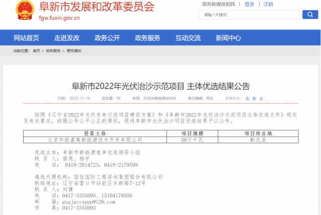 按照《遼寧省2022年光伏發(fā)電示范項目建設方案》和《阜新市2022年光伏治沙示范項目主體優(yōu)選文件》規(guī)定及有關要求,按照公開公平公正的原則,現(xiàn)將阜新市光伏治沙項目優(yōu)選結果予以公布。