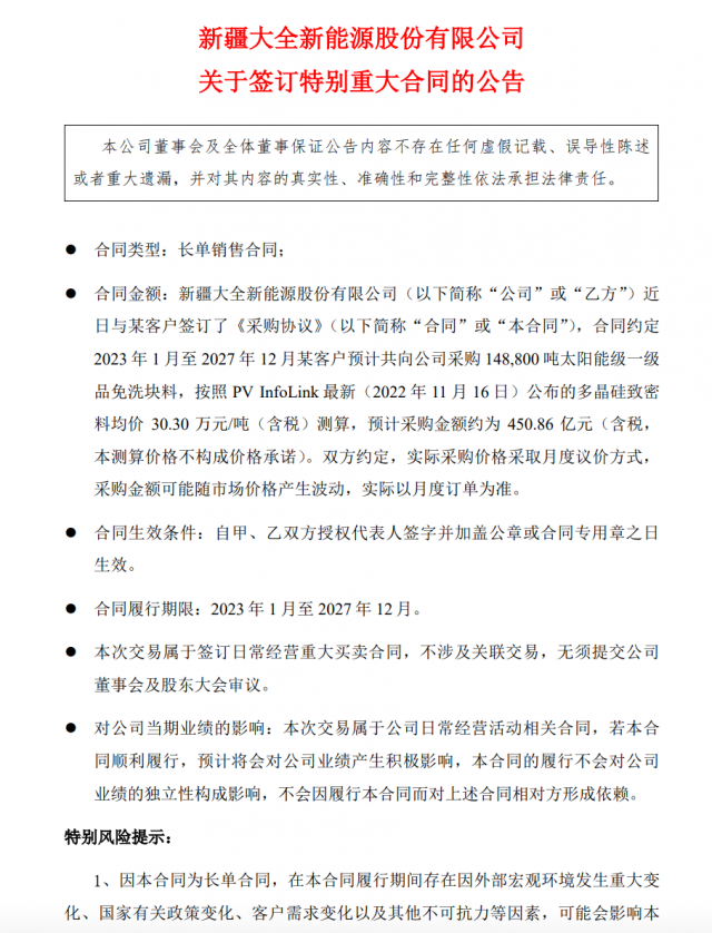 11月21日,大全能源(688303.SH)公告稱,與某客·戶簽訂《采購協(xié)議》,合同約定2023年1月至2027年12月某客戶預計采購148,800噸太陽能級一級品免洗塊料,按照PVInfolink最新公布的多晶硅致密料均價30.30萬元/噸(含稅)測算,預計采購金額約為450.86億元。