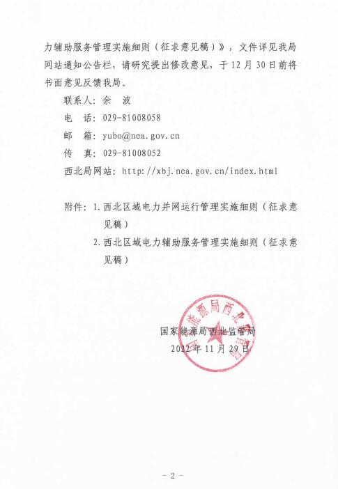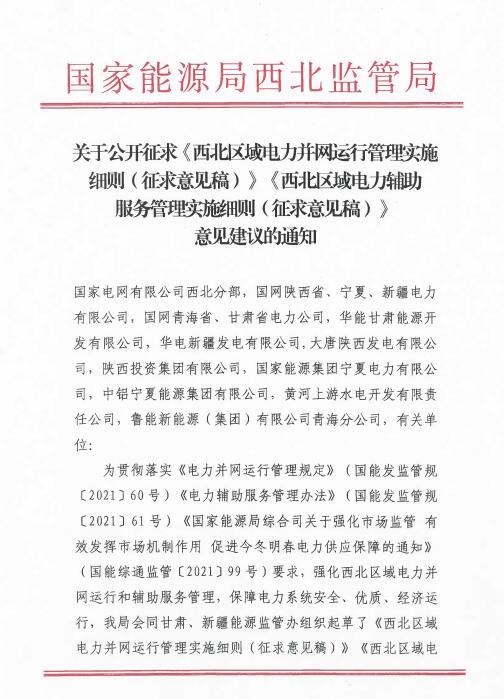 12月1日,國家能源局西北監(jiān)管局公開征求《西北區(qū)域電力并網(wǎng)運(yùn)行管理實(shí)施細(xì)則(征求意見稿)》《西北區(qū)域電力輔助服務(wù)管理實(shí)施細(xì)則(征求意見稿)》意見建議的通知。