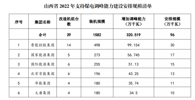 在煤電調(diào)峰安排清單中,主要企業(yè)為晉能、國家能源集團、山西國際、京能、華能、大唐等6家央國企,增加調(diào)峰能力3.2GW,安排新能源規(guī)模0.96GW。