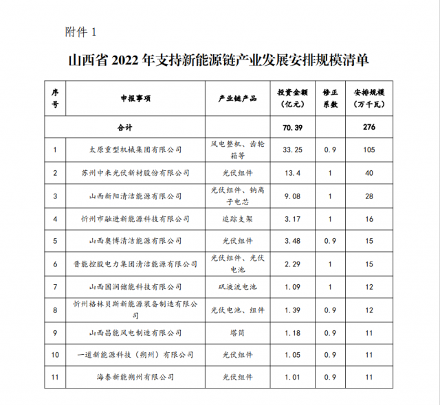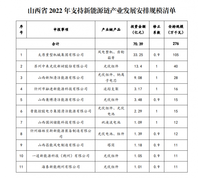 12月6日,山西省能源局公布《2022年支持新能源產(chǎn)業(yè)發(fā)展風電光伏發(fā)電建設規(guī)模評審結(jié)果》,規(guī)模共計3.72GW,其中新能源產(chǎn)業(yè)鏈企業(yè)11個家,總投資額達70.39億元,安排規(guī)模2.76GW;煤電調(diào)峰能力建設企業(yè)6家,安排0.96GW。