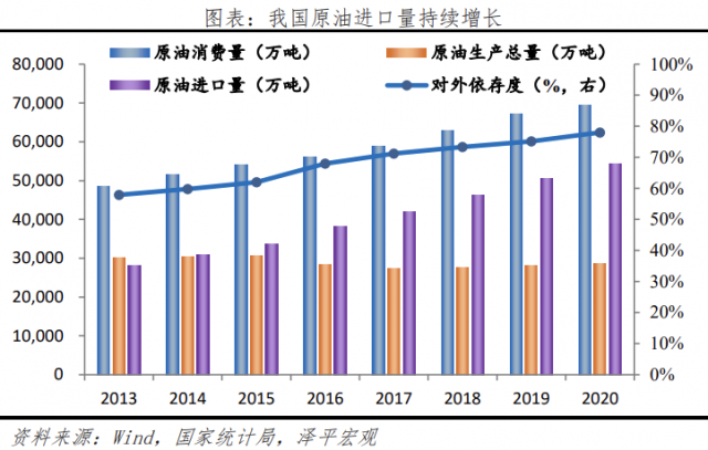二是對國家能源安全的保障。在交通運輸領域,我國石油消費量正不斷走高,從2015年的5.43億噸/年上升至2020年的7.36億噸/年。然而我國原油產量則一直維持在2億噸/年。供需矛盾致使我國的原油進口量持續(xù)增長,對外依存度超過70%。為保證國家的能源安全和經(jīng)濟的可持續(xù)發(fā)展,能源消費結構亟需升級。而發(fā)展新能源發(fā)電有利于減少我國對能源進口的依賴,保障國家能源安全。