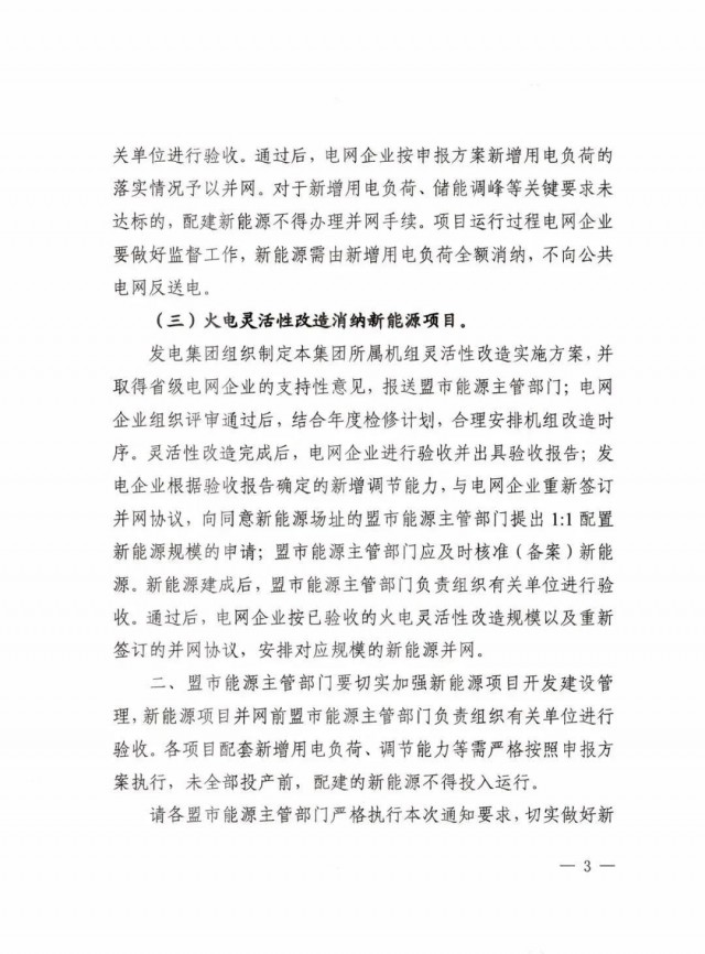 發(fā)電集團(tuán)組織制定本集團(tuán)所屬機(jī)組靈活性改造實(shí)施方案,并取得省級(jí)電網(wǎng)企業(yè)的支持性意見,報(bào)送盟市能源主管部門:電網(wǎng)企業(yè)組織評(píng)審?fù)ㄟ^后,結(jié)合年度檢修計(jì)劃,合理安排機(jī)組改造時(shí)序。靈活性改造完成后,電網(wǎng)企業(yè)進(jìn)行驗(yàn)收并出具驗(yàn)收?qǐng)?bào)告:發(fā)電企業(yè)根據(jù)驗(yàn)收?qǐng)?bào)告確定的新增調(diào)節(jié)能力,與電網(wǎng)企業(yè)重新簽訂并網(wǎng)協(xié)議,向同意新能源場(chǎng)址的盟市能源主管部門提出 1:1 配置新能源規(guī)模的申請(qǐng);盟市能源主管部門應(yīng)及時(shí)核準(zhǔn)(備案)新能源。新能源建成后,盟市能源主管部門負(fù)責(zé)組織有關(guān)單位進(jìn)行驗(yàn)收。通過后,電網(wǎng)企業(yè)按已驗(yàn)收的火電靈活性改造規(guī)模以及重新簽訂的并網(wǎng)協(xié)議,安排對(duì)應(yīng)規(guī)模的新能源并網(wǎng)。