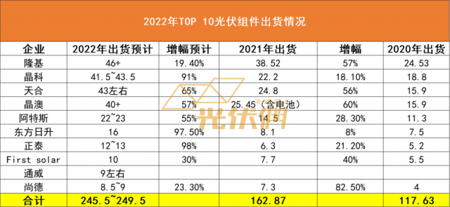 市場規(guī)模刷新紀(jì)錄的同時(shí),龍頭企業(yè)組件出貨規(guī)模也在快速攀升。近日,光伏們通過企業(yè)內(nèi)部咨詢、第三方統(tǒng)計(jì)機(jī)構(gòu)以及券商公開資料統(tǒng)計(jì)了2022年TOP 10組件出貨情況,10家企業(yè)合計(jì)出貨規(guī)模約為250GW,其中,前四家組件企業(yè)的出貨數(shù)據(jù)愈發(fā)膠著,排名爭奪戰(zhàn)一觸即發(fā)。