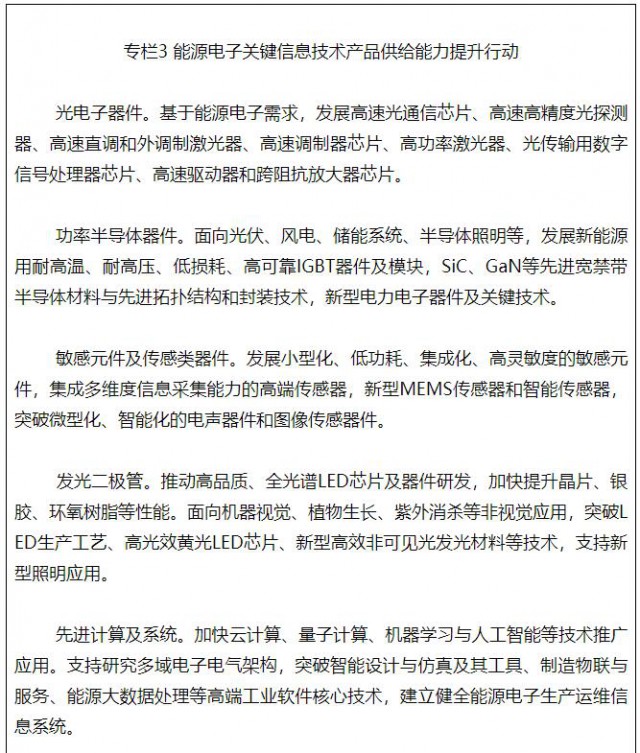 加強(qiáng)面向新能源領(lǐng)域的關(guān)鍵信息技術(shù)產(chǎn)品開發(fā)和應(yīng)用,主要包括適應(yīng)新能源需求的電力電子、柔性電子、傳感物聯(lián)、智慧能源信息系統(tǒng)及有關(guān)的先進(jìn)計(jì)算、工業(yè)軟件、傳輸通信、工業(yè)機(jī)器人等適配性技術(shù)及產(chǎn)品。研究小型化、高性能、高效率、高可靠的功率半導(dǎo)體、傳感類器件、光電子器件等基礎(chǔ)電子元器件及專用設(shè)備、先進(jìn)工藝,支持特高壓等新能源供給消納體系建設(shè)。推動(dòng)能源電子產(chǎn)業(yè)數(shù)字化、智能化發(fā)展,突破全環(huán)境仿真平臺(tái)、先進(jìn)算力算法、工業(yè)基礎(chǔ)軟件、人工智能等技術(shù)。推動(dòng)信息技術(shù)相關(guān)裝備及儀器創(chuàng)新發(fā)展。