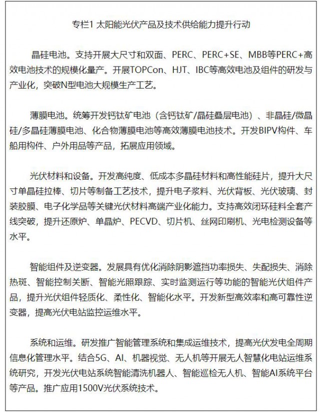 加快智能光伏創(chuàng)新突破,發(fā)展高純硅料、大尺寸硅片技術(shù),支持高效低成本晶硅電池生產(chǎn),推動(dòng)N型高效電池、柔性薄膜電池、鈣鈦礦及疊層電池等先進(jìn)技術(shù)的研發(fā)應(yīng)用,提升規(guī)?;慨a(chǎn)能力。鼓勵(lì)開發(fā)先進(jìn)適用的智能光伏組件,發(fā)展智能逆變器、控制器、匯流箱、跟蹤系統(tǒng)等關(guān)鍵部件。加大對(duì)關(guān)鍵技術(shù)裝備、原輔料研發(fā)應(yīng)用的支持力度。鼓勵(lì)開發(fā)安全便捷的戶用智能光伏系統(tǒng),鼓勵(lì)發(fā)展光伏充電寶、穿戴裝備、交通工具等移動(dòng)能源產(chǎn)品。探索建立光伏“碳足跡”評(píng)價(jià)標(biāo)準(zhǔn)并開展認(rèn)證。加快構(gòu)建光伏供應(yīng)鏈溯源體系,推動(dòng)光伏組件回收利用技術(shù)研發(fā)及產(chǎn)業(yè)化應(yīng)用。