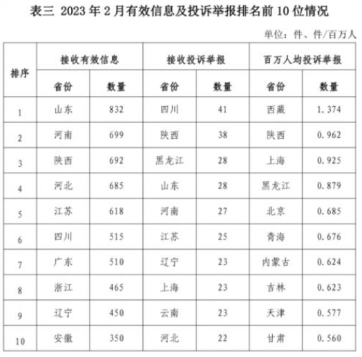 各省(自治區(qū)、直轄市)按照接收的有效信息數(shù)量排序,山東、河南、陜西、河北、江蘇、四川、廣東、浙江、遼寧、安徽排在全國前10位;按照接收的投訴舉報(bào)數(shù)量排序,四川、陜西、黑龍江、山東、河南、江蘇、遼寧、上海、云南、河北排在全國前10位;按照百萬人均投訴舉報(bào)數(shù)量排序,西藏、陜西、上海、黑龍江、北京、青海、內(nèi)蒙古、吉林、天津、甘肅排在全國前10位。(2023年2月有效信息及投訴舉報(bào)排名前10位情況見表三)