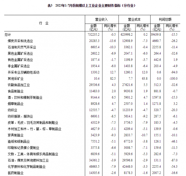 1—7月份,規(guī)模以上工業(yè)企業(yè)實(shí)現(xiàn)營業(yè)收入73.22萬億元,同比下降0.5%;發(fā)生營業(yè)成本62.40萬億元,增長0.2%;營業(yè)收入利潤率為5.39%,同比下降0.95個(gè)百分點(diǎn)。