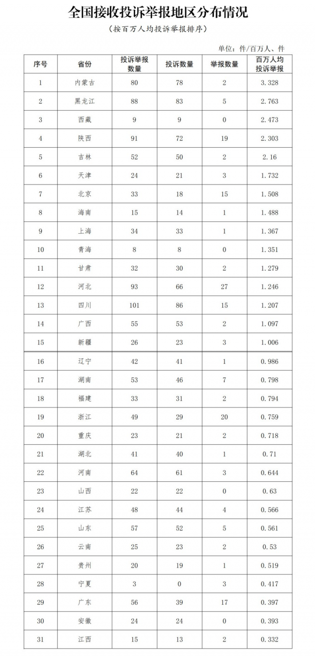 各省(自治區(qū)、直轄市)按照接收投訴舉報數(shù)量排序,四川、河北、陜西、黑龍江、內蒙古排在全國前5位。其中:按投訴數(shù)量排序,四川、黑龍江、內蒙古、陜西、河北排在全國前5位;按舉報數(shù)量排序,河北、浙江、陜西、廣東、北京(四川并列)排在全國前5位;按百萬人均投訴舉報數(shù)量排序,內蒙古、黑龍江、西藏、陜西、吉林排在全國前5位。(全國接收投訴舉報地區(qū)分布情況詳見附件1)